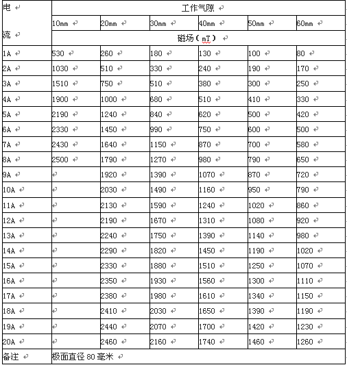 4.4 磁場強度:工作氣隙20mm時,80mm極頭中心磁場最大H≥2.2T